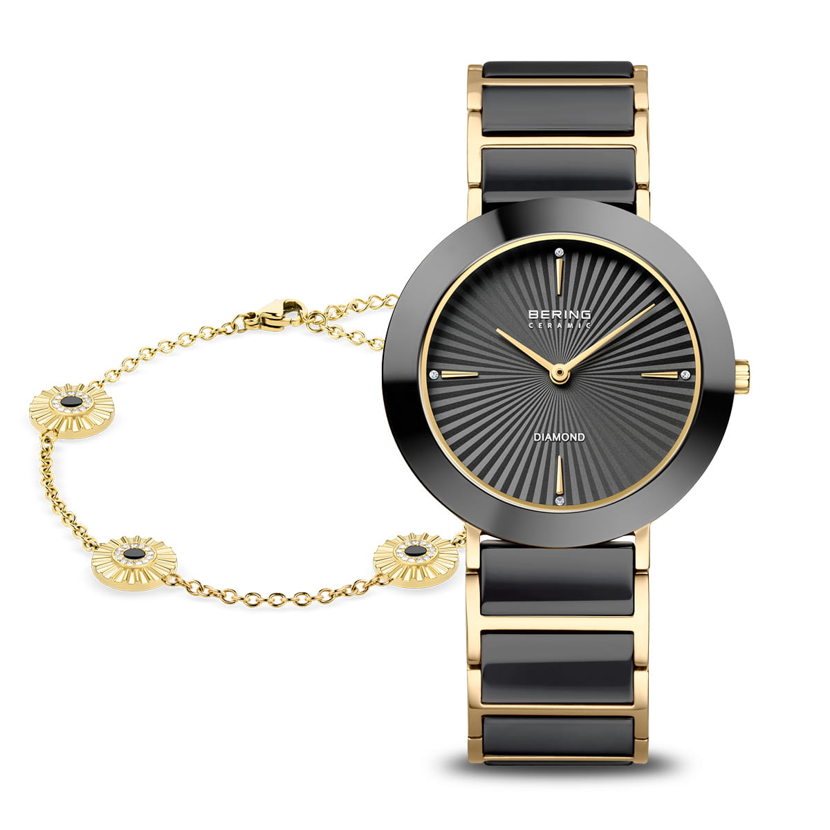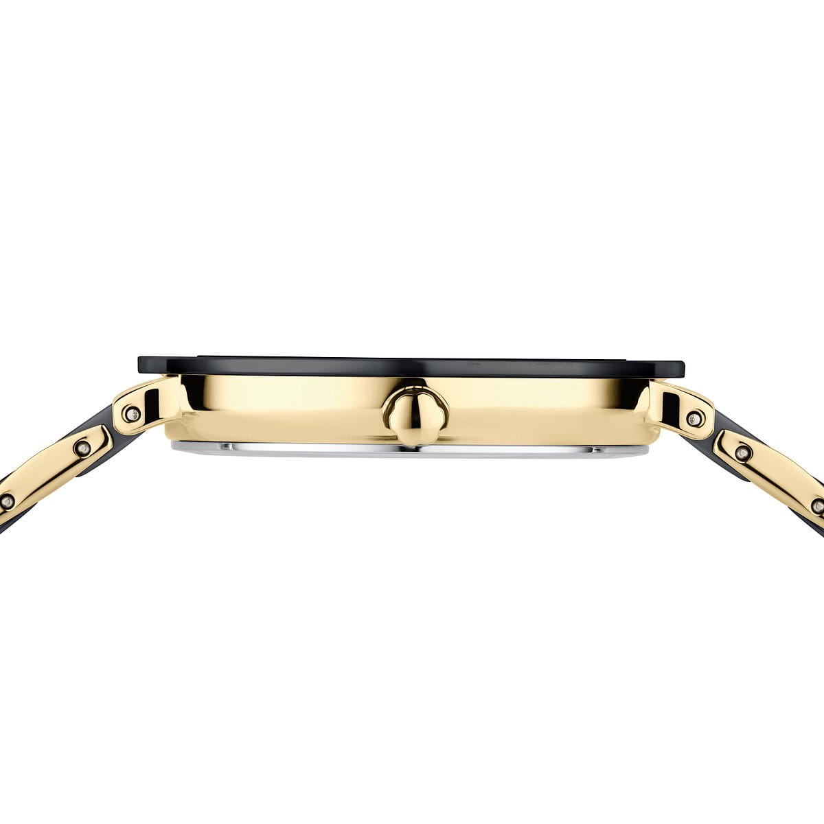 BERING dameuret 11435-732-GWP forener dyb sort, varm guldtone og klarhed i et harmonisk design. Det runde urhus i poleret sort high-tech keramik er smukt indrammet af guldfarvet rustfrit stål – en kontrast, der er både moderne og tidløs.