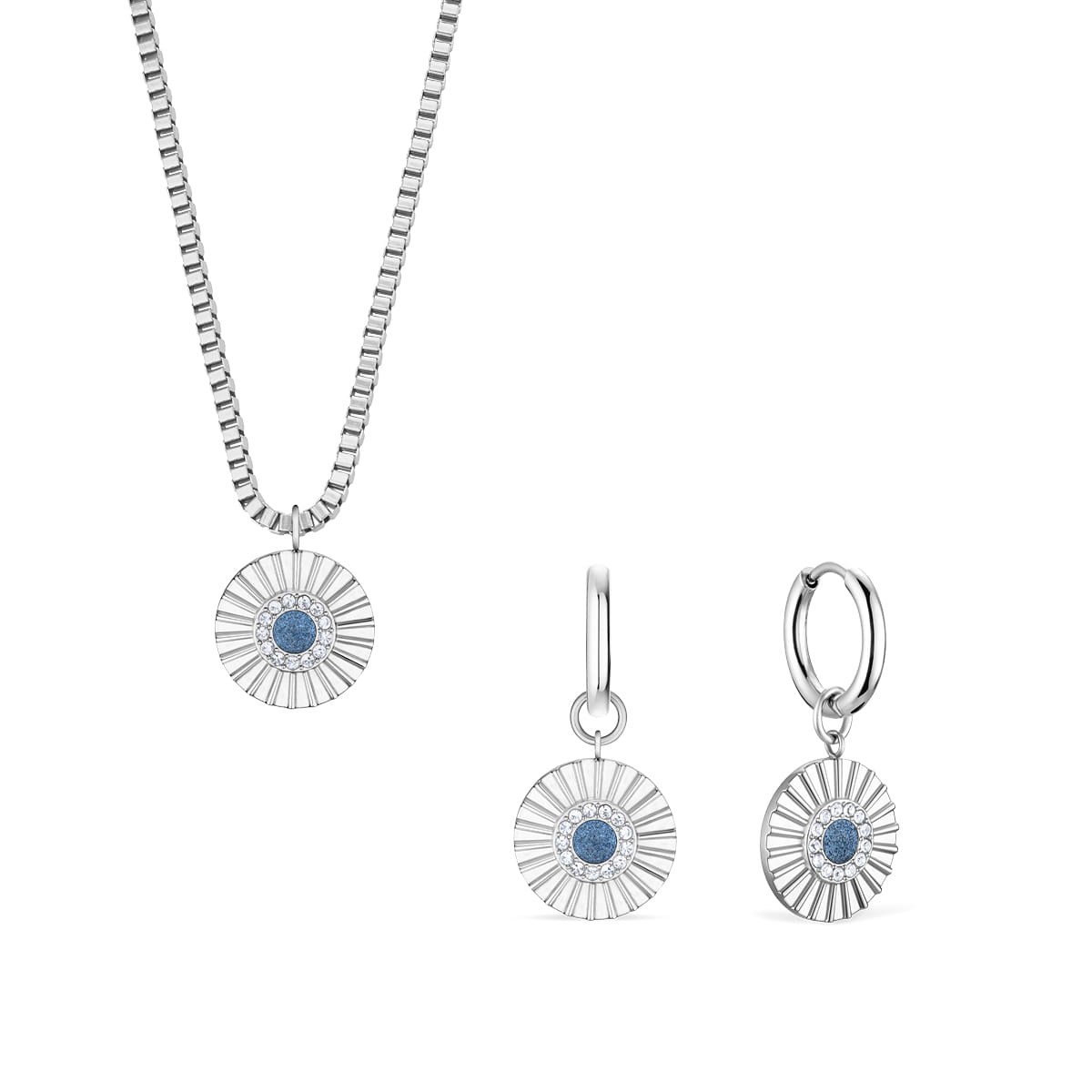 Dette smykkesæt fra BERINGs Arctic Flowers-kollektion forener kølig elegance med dyb farve. Den runde vedhæng med solstrålegravering rummer en blå facetslebet zirkonia – som en isblomst i fuldt flor. Sølvfarvet stål fremhæver stenens ro og klarhed.