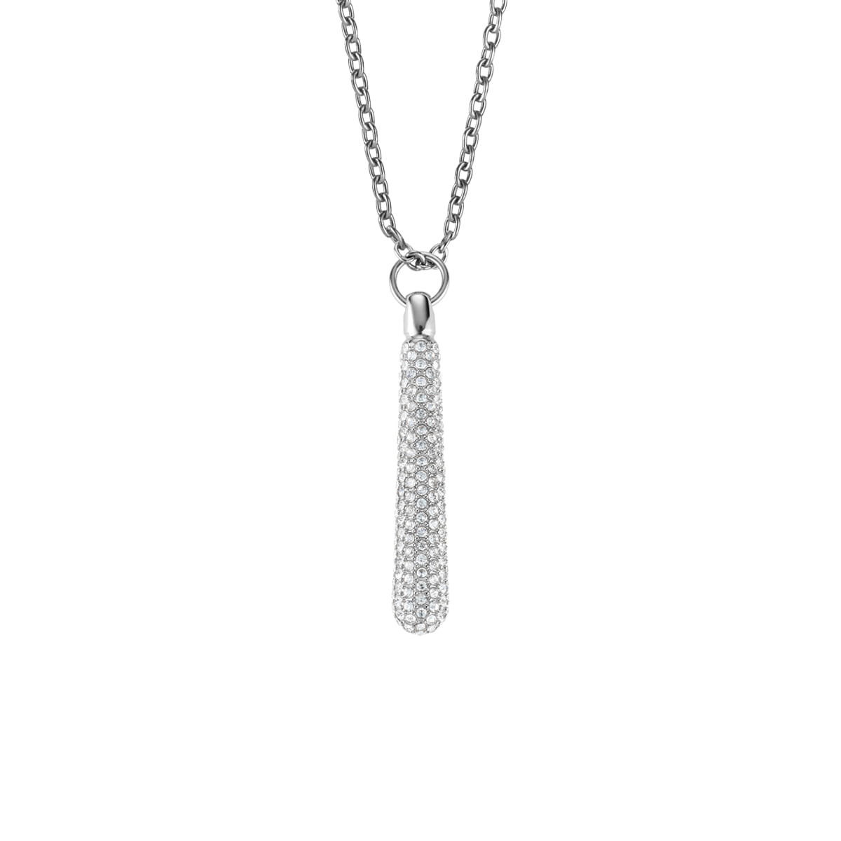 Et smykke, der imponerer med sin enkle raffinement: Denne sølvfarvede halskæde med dråbeformet vedhæng sætter funklende accenter og tilføjer et elegant touch til ethvert outfit. Det aflange vedhæng er helt besat med hvidt krystalglas i pavé-stil og skaber et livligt samspil mellem lys og glitter.