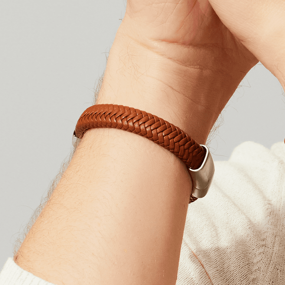 633-819-X0 fra Arctic Symphony-kollektionen kombinerer flettet brunt kalvelæder med kølige detaljer i rustfrit stål. Den varme nuance minder om drivtømmer og arktisk tundra – underspillet, men fuld af karakter.