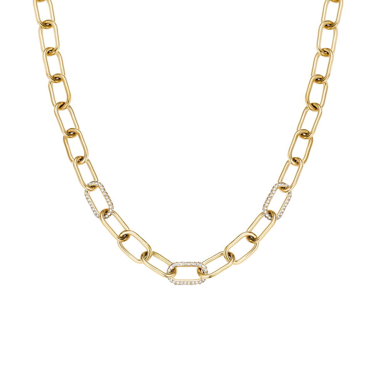 En moderne og karakterfuld halskæde fra BERINGs Arctic Link-kollektion, der kombinerer guldfarvede led med funklende hvide krystaller. Det varme metal og de klare sten skaber et kontrastfuldt udtryk med et strejf af eksklusivitet.