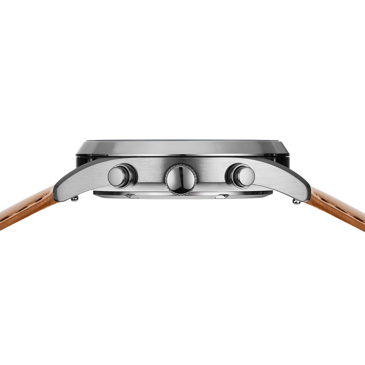 Den sølvskinnende urkasse i rustfrit stål danner en flot kontrast til den grønne skive, mens det orange sekundviser tilfører et energisk strejf. Tre chronograf-funktioner og et diskret datovindue kl. 4 giver praktisk overblik. Den brune kalvelæderrem med klassisk spænde sikrer komfort og et tidløst look.