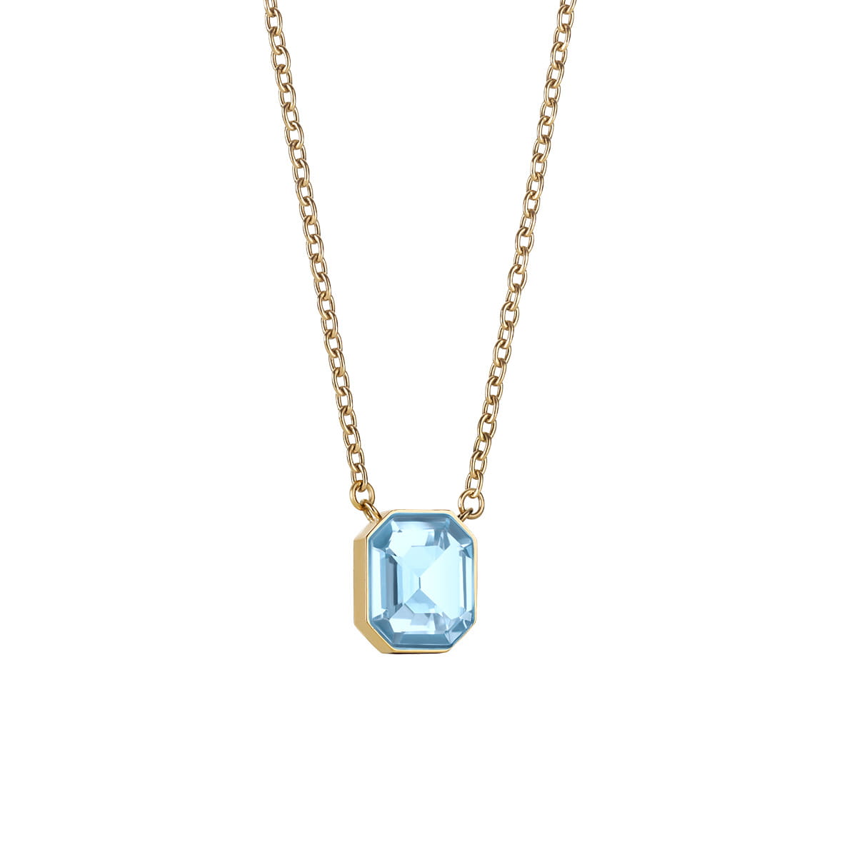 Denne halskæde med et lyseblåt, smaragdskåret krystal i en varm guldfarvet indfatning kombinerer klassisk stil med moderne glød – perfekt til alle lejligheder.