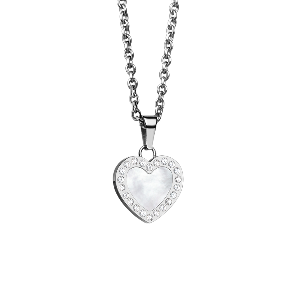 Filigranhalskæden med hjertevedhæng er en rigtig eyecatcher. Perlemor og slebne krystaller giver smykket et elegant og glamourøst look.
