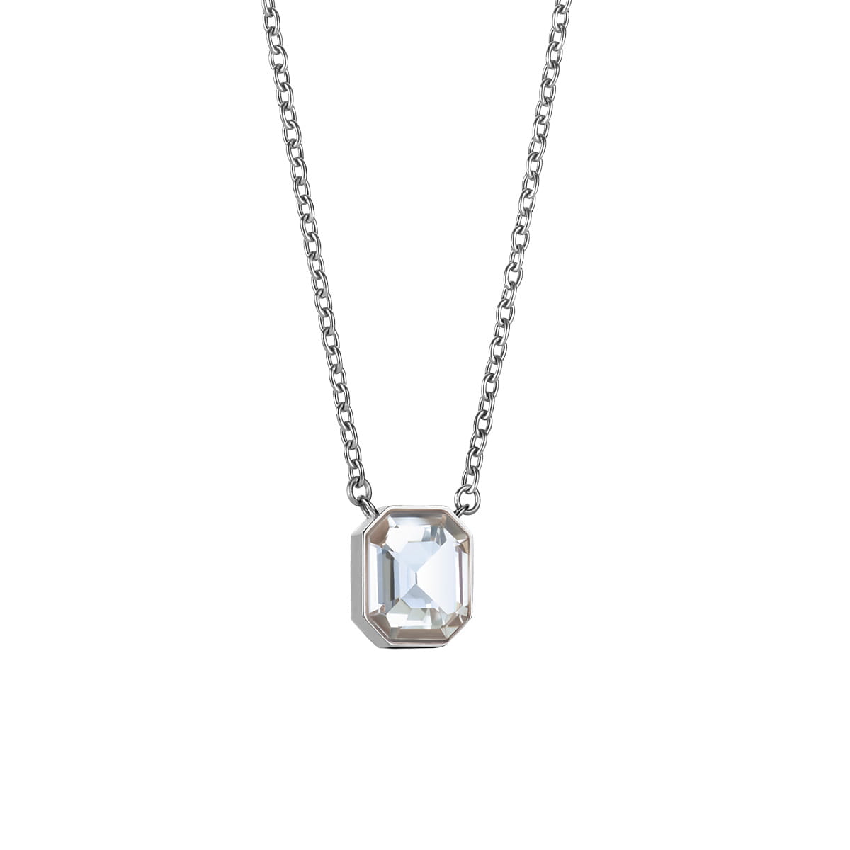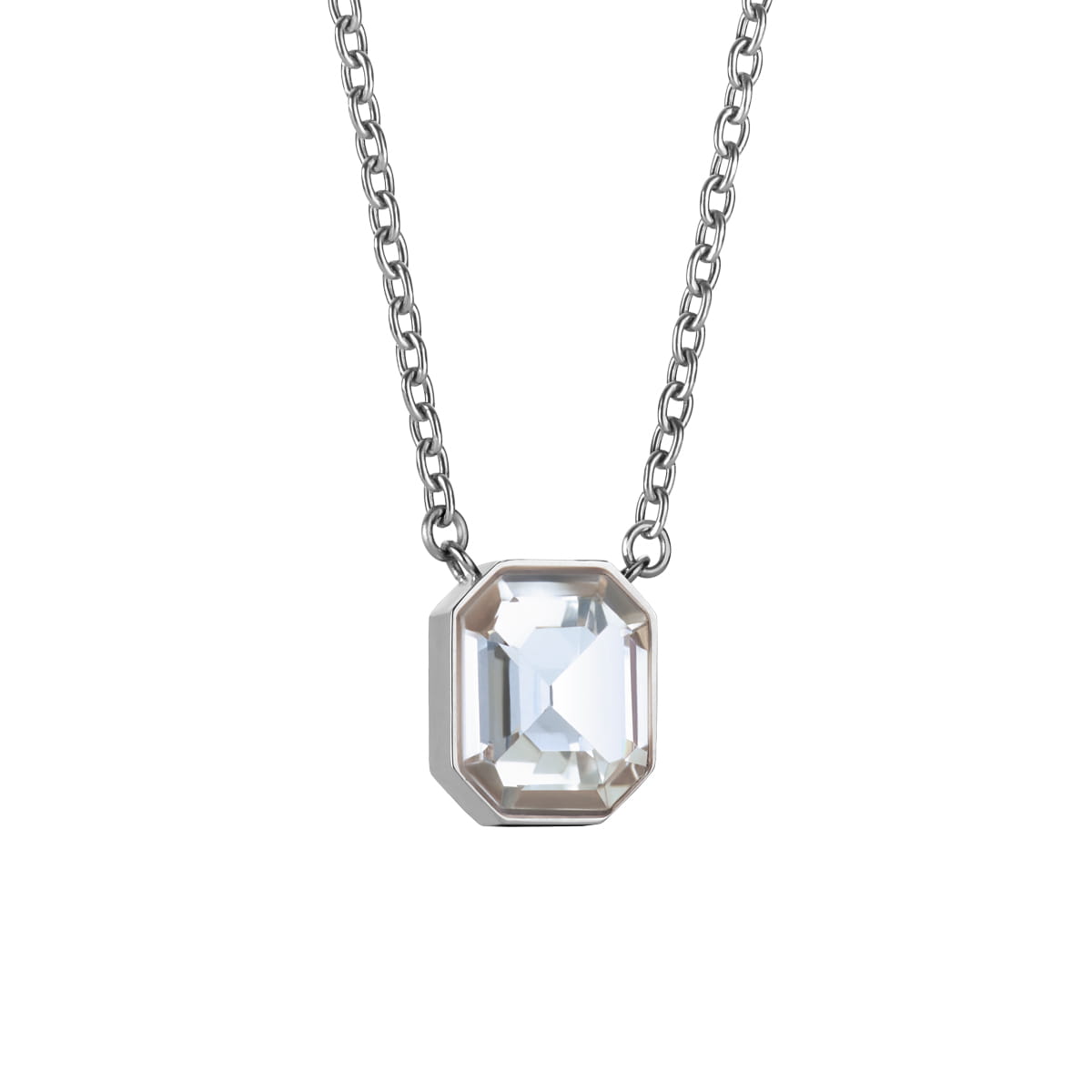 Denne halskæde fremhæver en moderne, kantet krystal i smaragdslib. Den er indfattet i køligt rustfrit stål og hænger på en fin kæde – en perfekt kombination af enkelthed og elegance til både hverdag og fest.