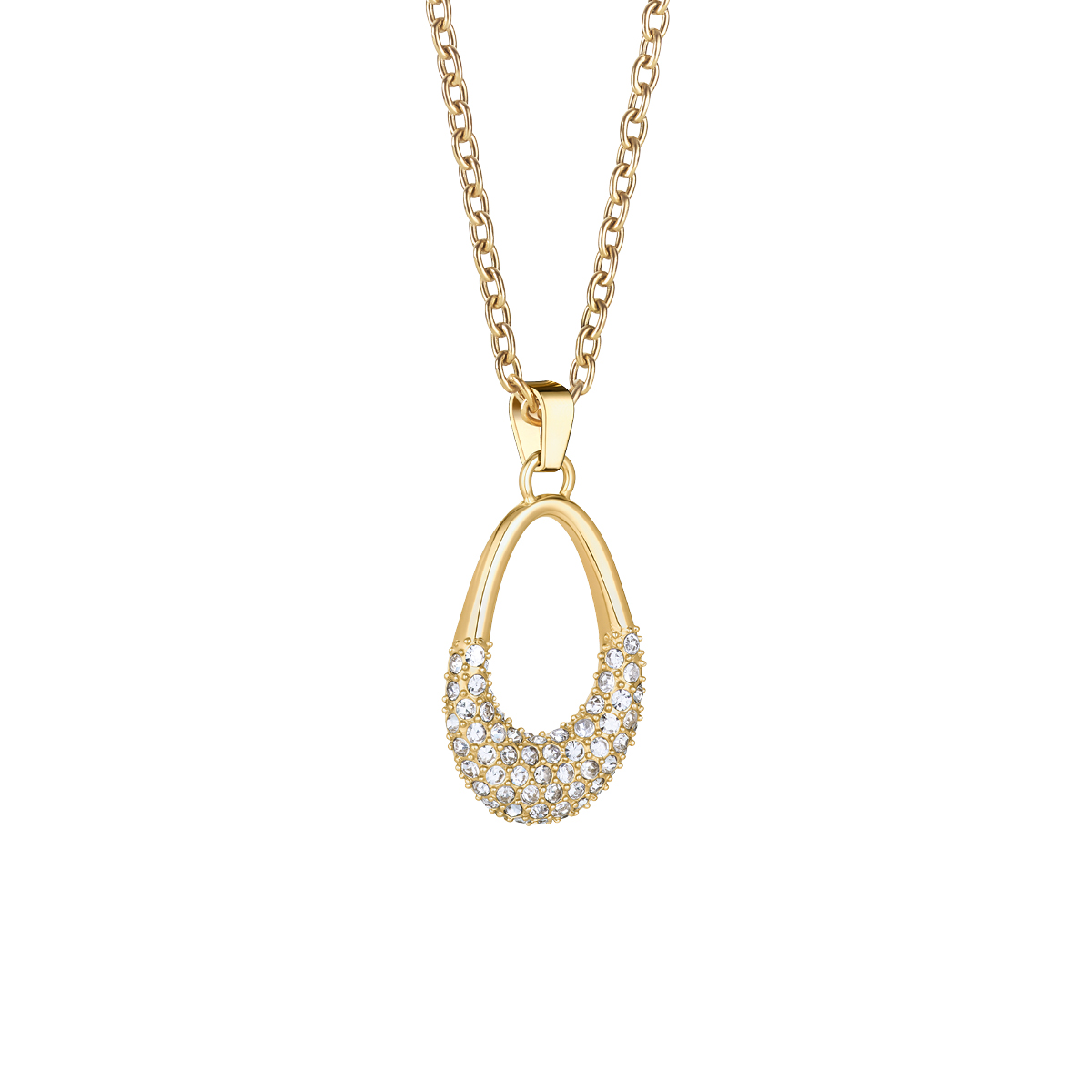 El collar 457-27-500 combina la elegancia clásica con el brillo cálido del oro. Su colgante en forma de gota, adornado con cristales pavé que capturan la luz con delicadeza, aporta un toque de lujo y sofisticación a cualquier look. Su diseño equilibrado expresa feminidad, estilo y modernidad.