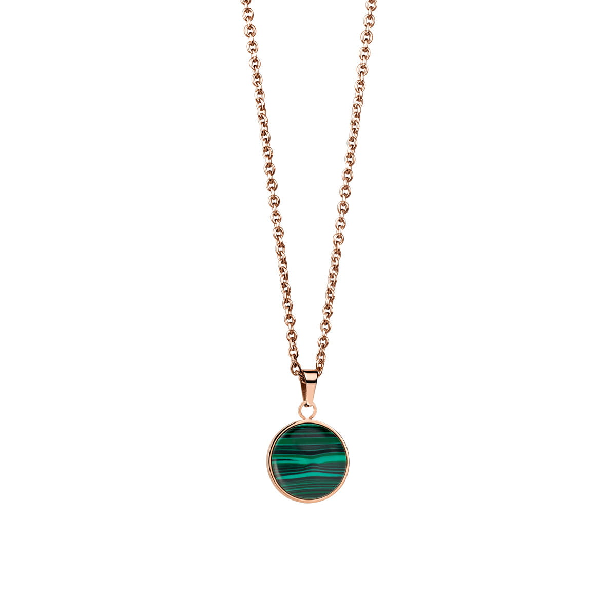 El modelo 430-37-X0 está elaborado con malaquita auténtica y acero inoxidable color oro rosado. Forma parte de la colección Arctic Symphony y está disponible en varias longitudes.