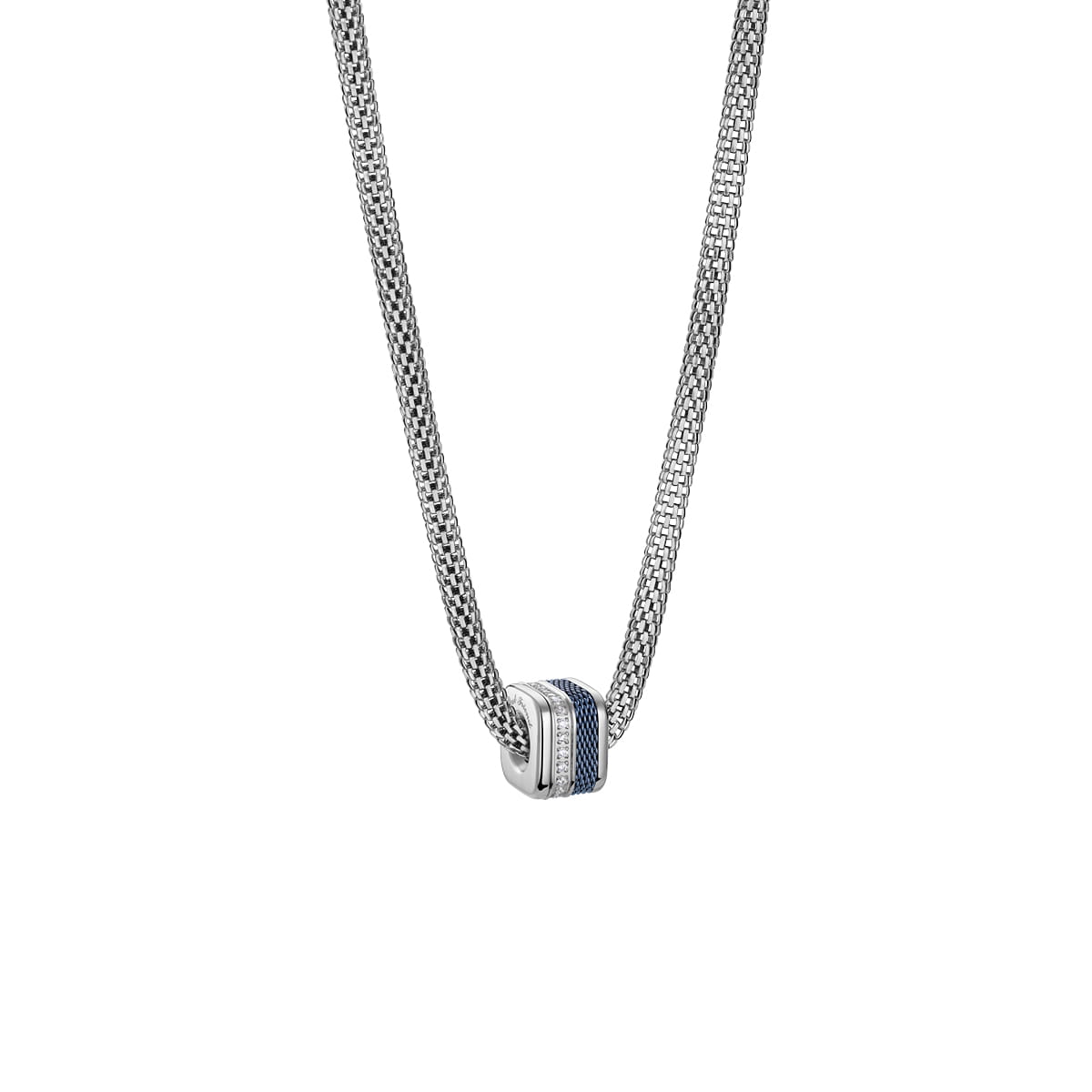 Das Highlight: ein geometrisch gearbeiteter Bead aus poliertem Edelstahl, kunstvoll veredelt mit funkelnden weißen und tiefblauen Zirkonia-Elementen. Die Farbe erinnert an das wechselhafte Licht des arktischen Eises – mal kühl und kristallklar, mal tief und geheimnisvoll wie der Nordatlantik. Die feinen Glieder der 450 mm langen Kette reflektieren das Licht in ständiger Bewegung und lassen das Schmuckstück bei jeder Bewegung lebendig wirken.