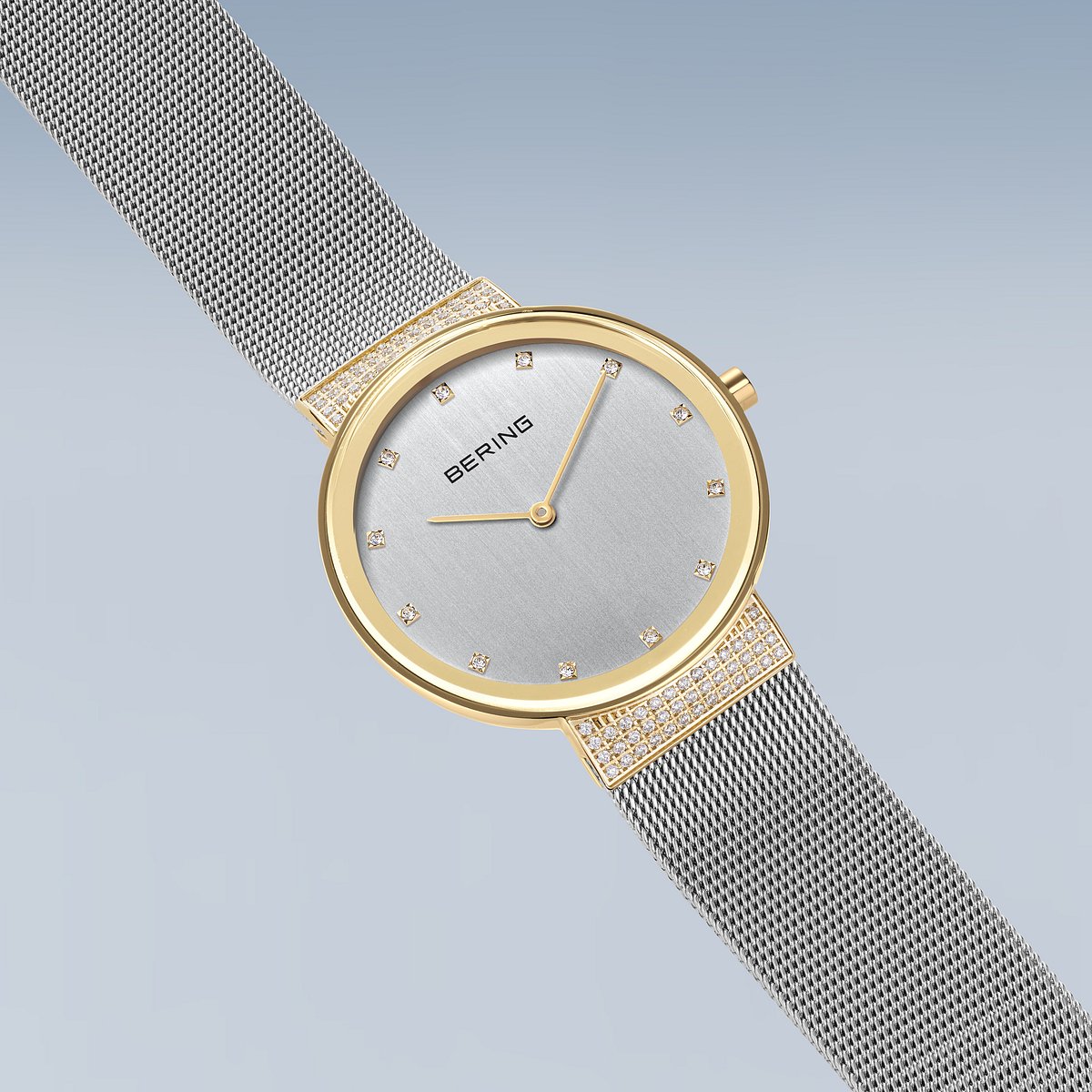 Esta elegante pieza de la colección Classic de BERING combina el diseño minimalista escandinavo con un refinado toque de oro. La esfera plateada cepillada irradia sobriedad, mientras que los cristales de Swarovski marcan las horas con un brillo discreto.