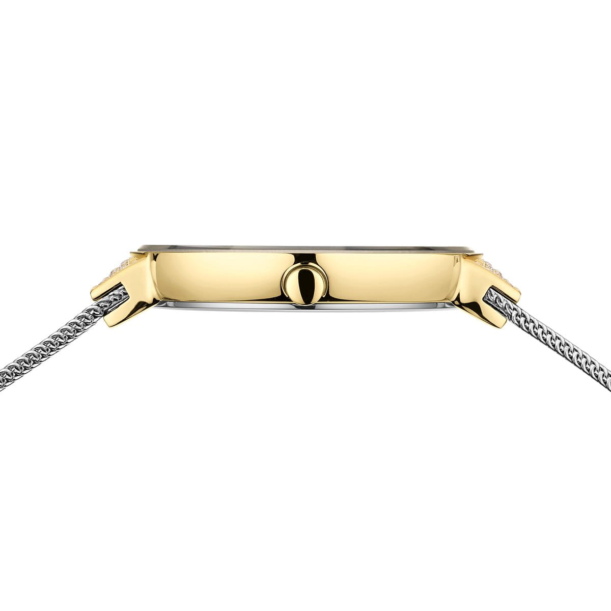 La caja de acero inoxidable dorado, pulida a alto brillo, se integra con fluidez en la correa milanesa plateada. Una combinación bicolor que transmite equilibrio y estilo. Con solo unos 6 mm de grosor, el reloj se ajusta con ligereza y elegancia.