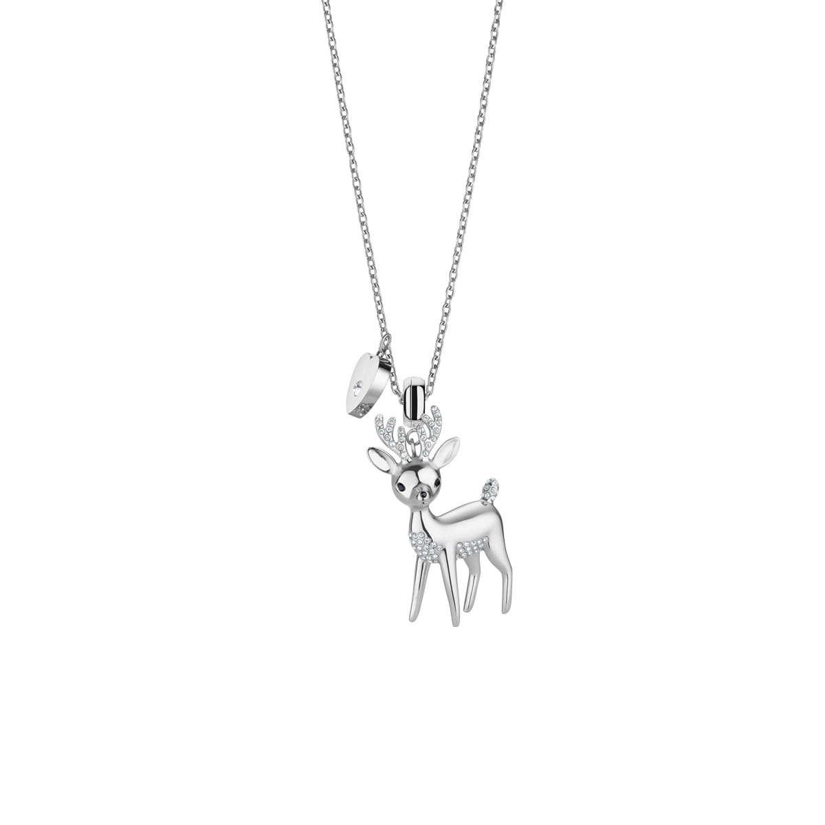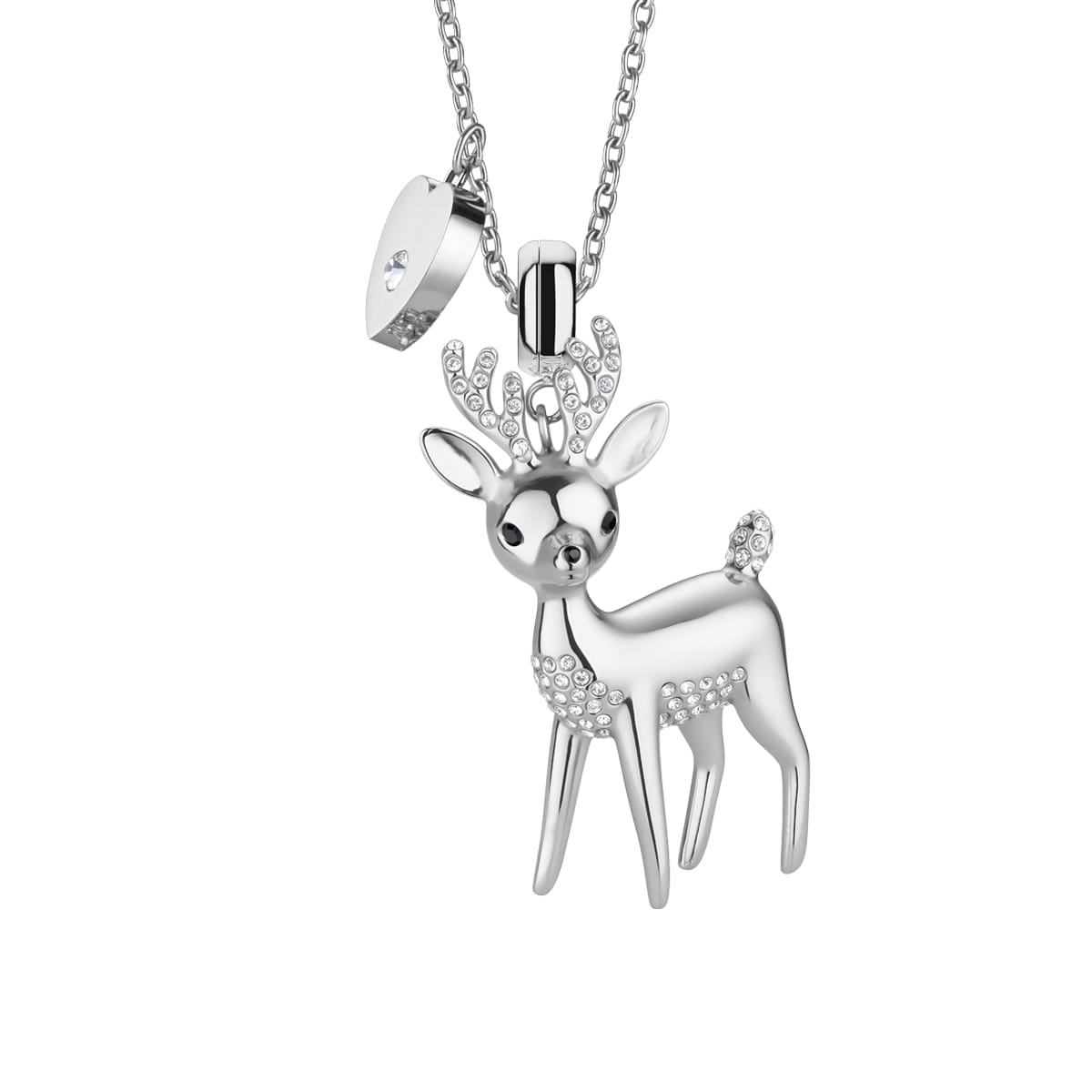 El reno, elaborado en acero inoxidable plateado y pulido, está acompañado por una pequeña placa en forma de corazón con el logotipo de BERING grabado – un símbolo de amor y conexión con la naturaleza. La cadena fina aporta ligereza y comodidad para el uso diario.