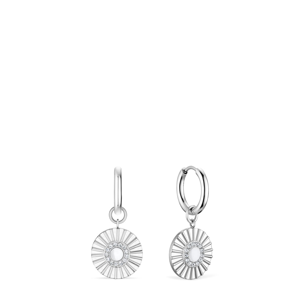 This Arctic Flowers jewellery set by BERING presents its most minimalist and refined version: crafted in silver-toned stainless steel with a faceted white zirconia at the centre. The circular pendant and earrings feature delicate ray-like engravings, evoking frost flowers or snow blossoms touched by light. A pavé-set halo surrounds the centre stone, creating a subtle sparkle with every movement.