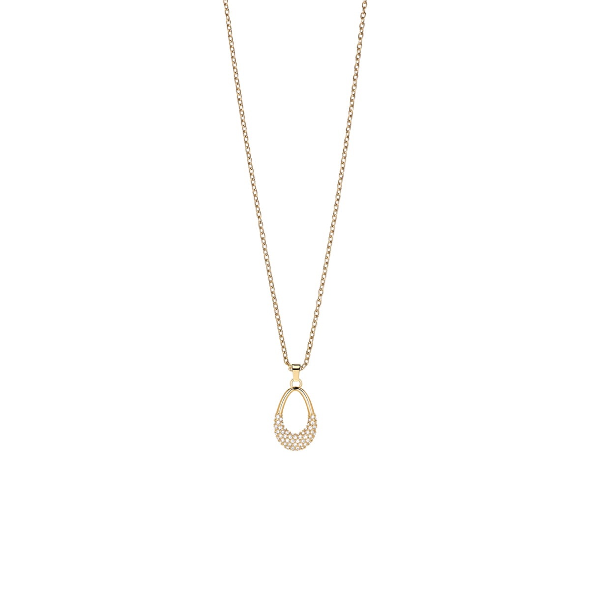 The 457-27-500 necklace combines refined elegance with a touch of golden radiance. Its teardrop-shaped pendant in a luxurious gold tone is adorned with sparkling pavé-set crystals that catch the light beautifully, creating a warm and sophisticated glow. The balanced design embodies feminine grace and modern simplicity, making it a timeless piece for any occasion.