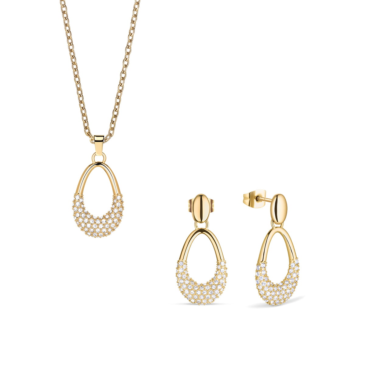 Crafted from gold-toned stainless steel with pavé-set zirconia. Part of the Arctic Symphony collection. The earrings mirror the pendant’s graceful oval shape for a perfectly matched look.