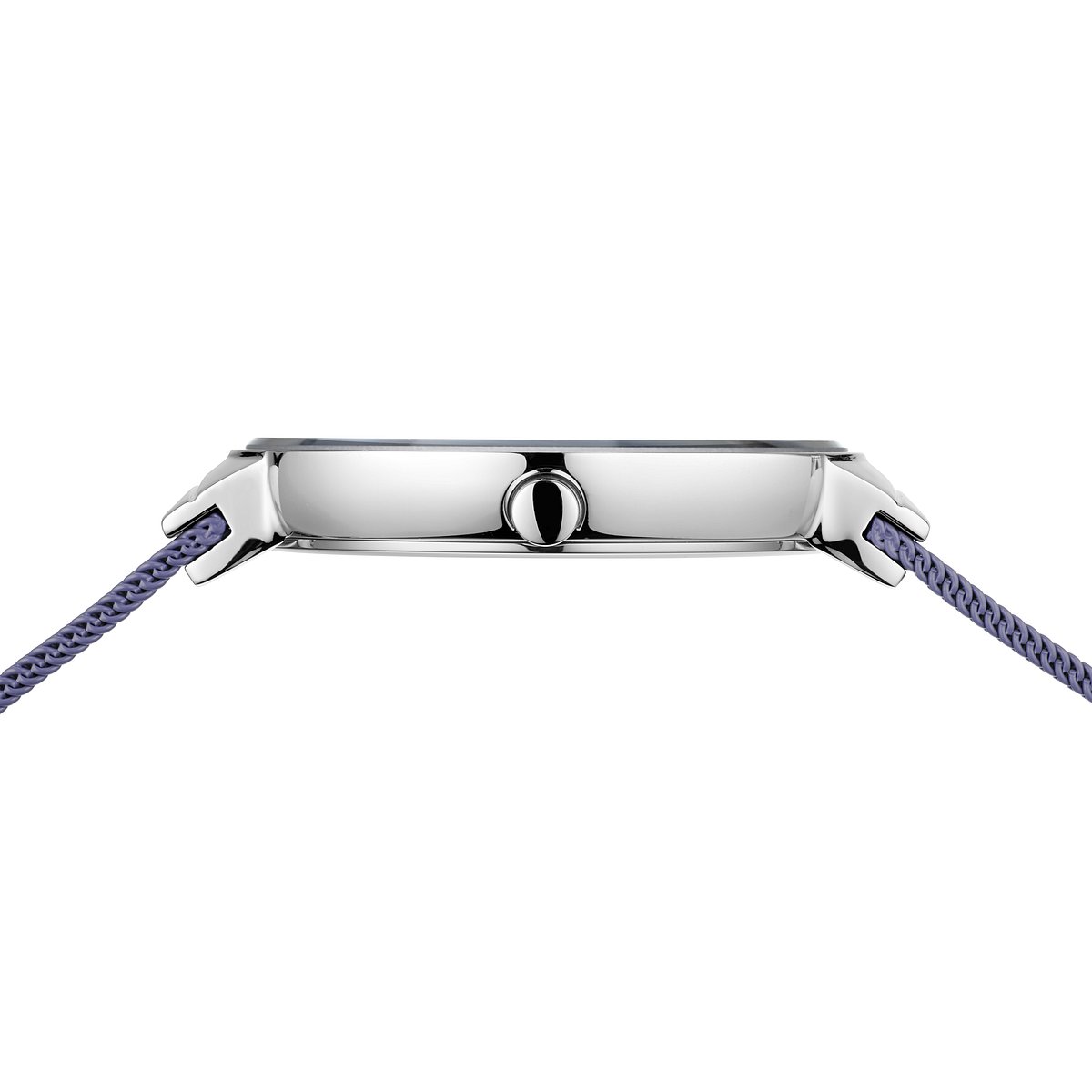 The finely woven lavender-toned Milanese strap perfectly complements the dial, offering both comfort and a distinctive look. Housed in a slim stainless steel case with scratch-resistant sapphire crystal, a precise quartz movement ensures reliable timekeeping.