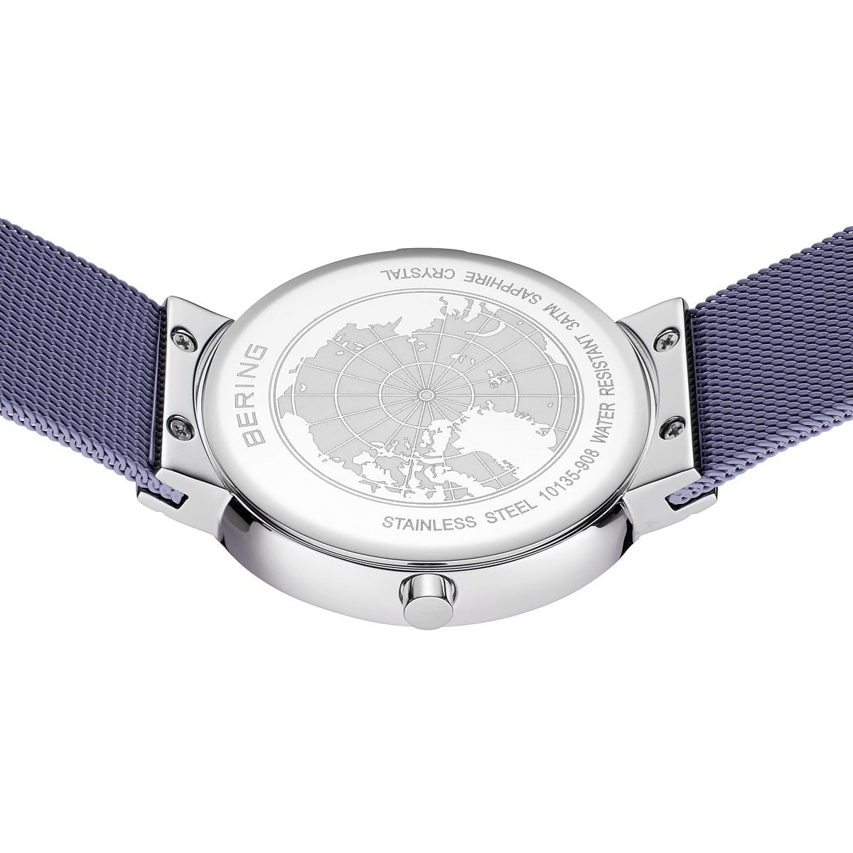 The BERING 10135-908 makes a bold statement without being loud. Its contemporary colour palette of soft lavender blue and polished silver stainless steel evokes the delicate glow of Arctic skies at dusk. The violet sunray dial captures the light with elegance – a graceful interplay of depth and reflection. Twelve Swarovski crystals bring refined sparkle to its minimalist design.