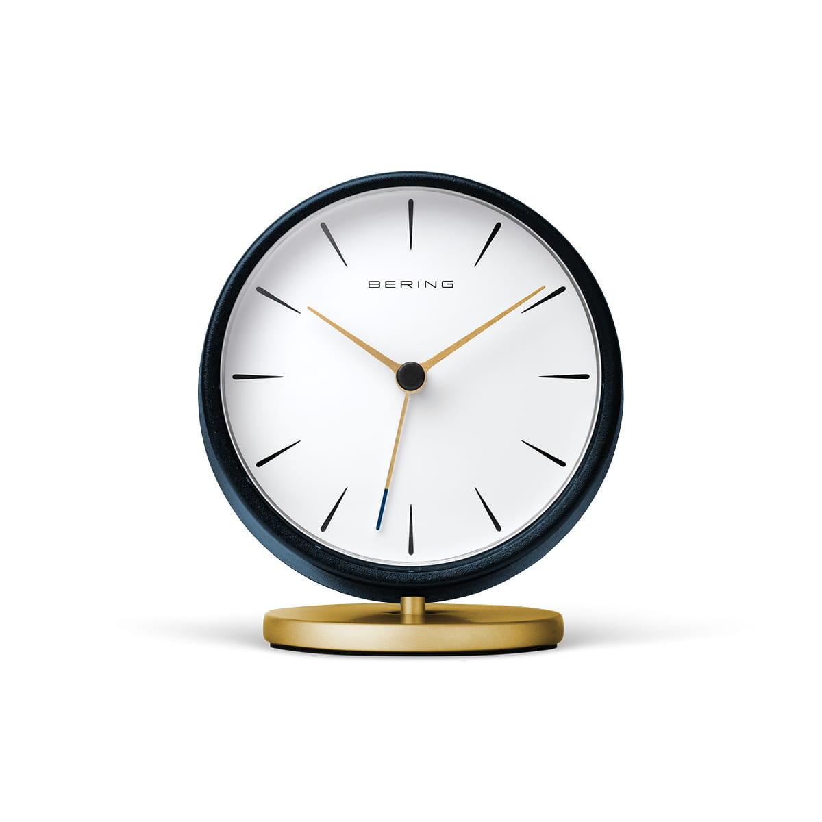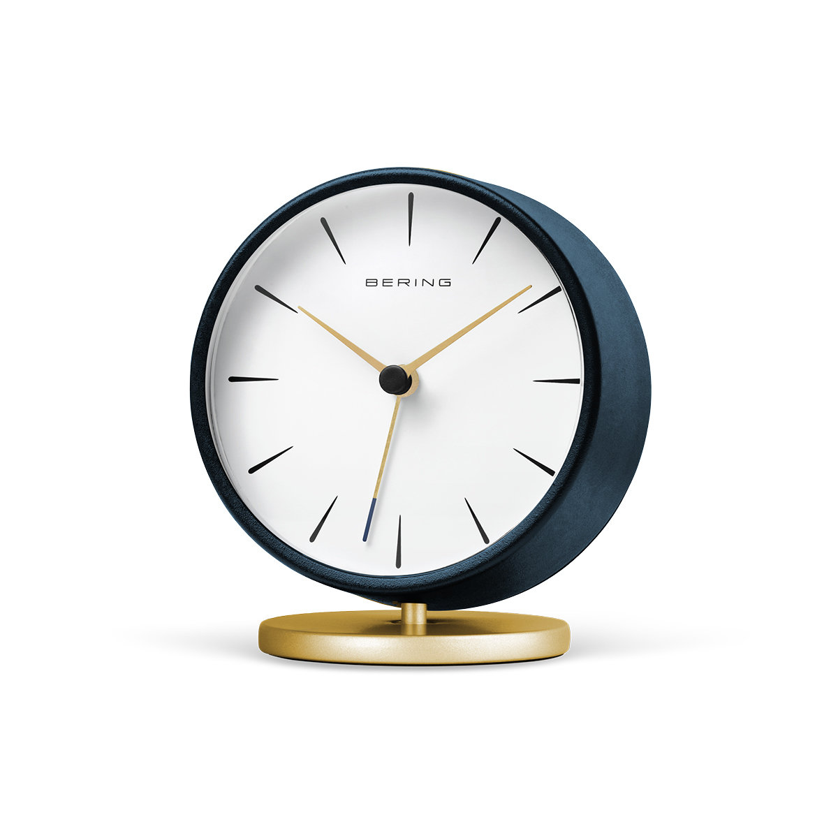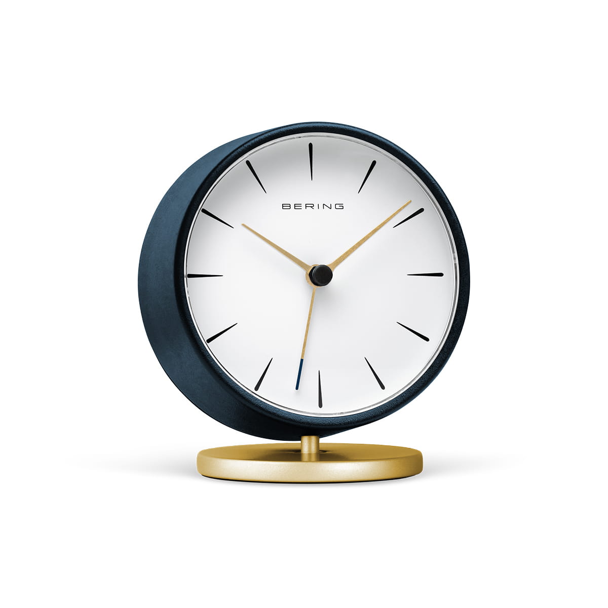 The BERING desk clock 90096-634R brings Nordic simplicity to your interior. A deep blue aluminium case encircles a matte white dial, featuring minimalist black hour markers and slim, gold-tone hands. The second hand, also gold with an Arctic blue tip, adds a subtle highlight to the minimalist design.
