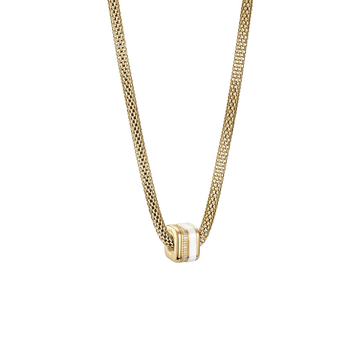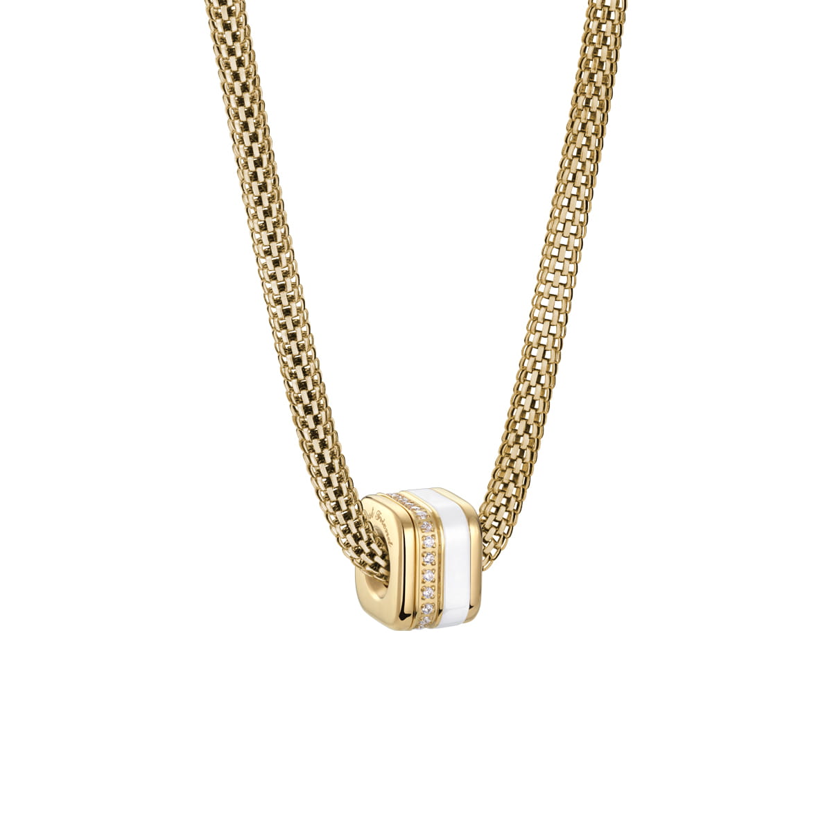 Der Charm besticht durch seine harmonische Dreiteilung: goldfarbener Edelstahl, zarte weiße Keramikeinlagen und eine filigrane Reihe aus weißen Zirkonia. Diese funkelnden Akzente erinnern an Eiskristalle im Sonnenlicht – eingefangen in einem sanften, goldenen Rahmen. Die weiße Keramik setzt einen puristischen Kontrapunkt zur warmen Metallfarbe und verleiht dem Design seine charakteristische Ruhe und Tiefe.