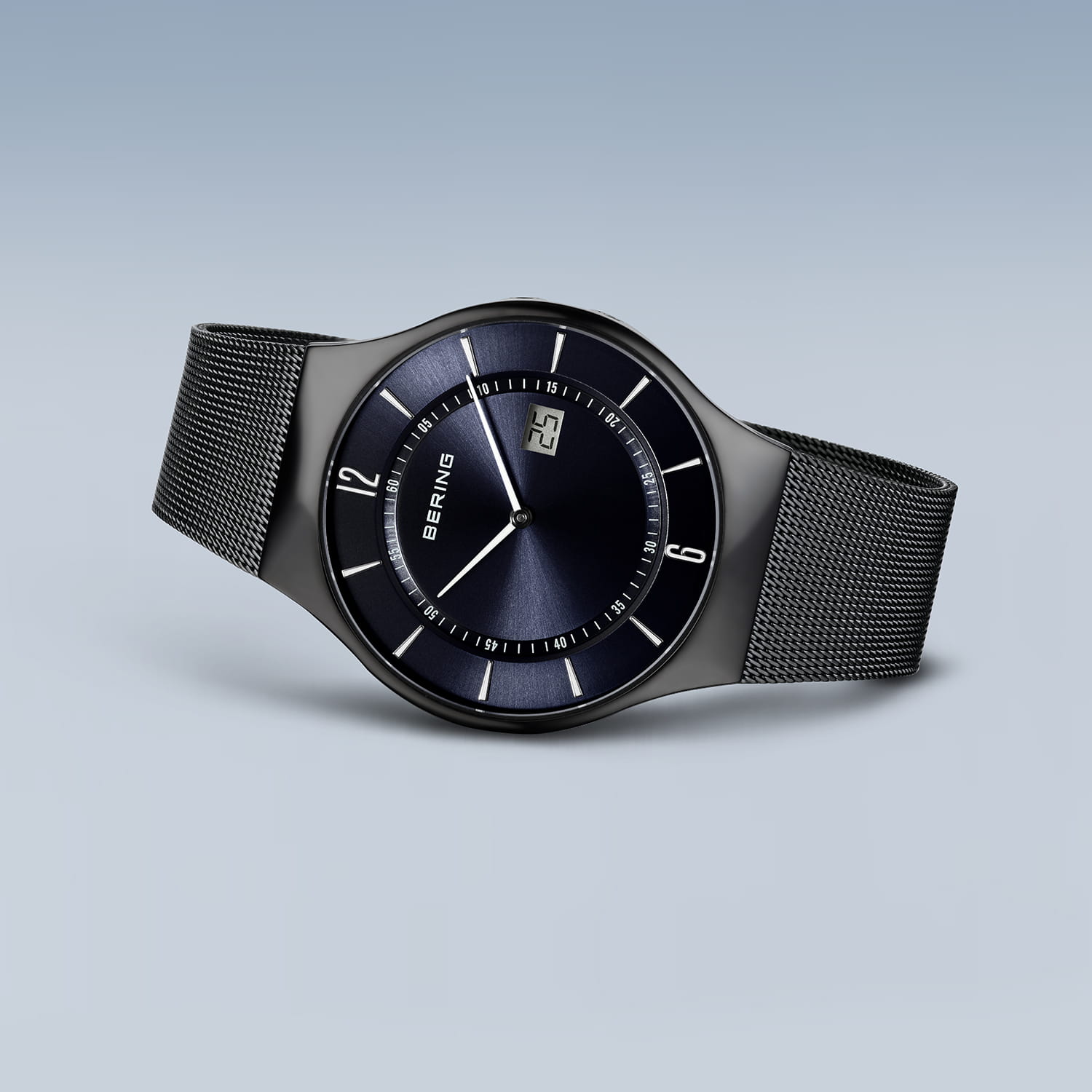 Het BERING-horloge 51640-227 combineert een strak minimalistisch design met de precisie van radiogestuurde technologie. De diepblauwe Sunray-wijzerplaat speelt prachtig met het licht en wordt aangevuld door zilverkleurige indexen en duidelijke wijzers. Een subtiel digitaal venster toont de datum modern en helder.