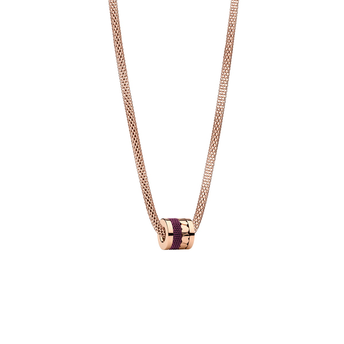 Gemaakt van roségoudkleurig roestvrijstalen mesh, aangevuld met een 8,0 mm brede roestvrijstalen charm met paarse meshstructuur. Dit set is een uitdrukking van gevoel, stijl en individualiteit.