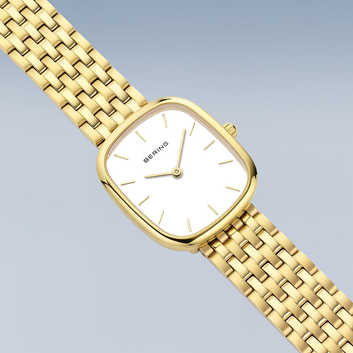 Das weich gerundete, rechteckige Gehäuse aus goldfarbenem Edelstahl verleiht der Uhr eine moderne, zugleich feminine Silhouette. Das helle, silberfarbene Zifferblatt unterstreicht die arktische Klarheit des Designs und bildet einen harmonischen Kontrast zu den filigranen, goldfarbenen Indizes und Zeigern. Ohne überflüssige Details entsteht eine ruhige, ausgewogene Ästhetik, die sich mühelos in jeden Stil integriert. Das fein gearbeitete Gliederarmband aus goldfarbenem Edelstahl schmiegt sich elegant ans Handgelenk und sorgt für einen sicheren, komfortablen Sitz.