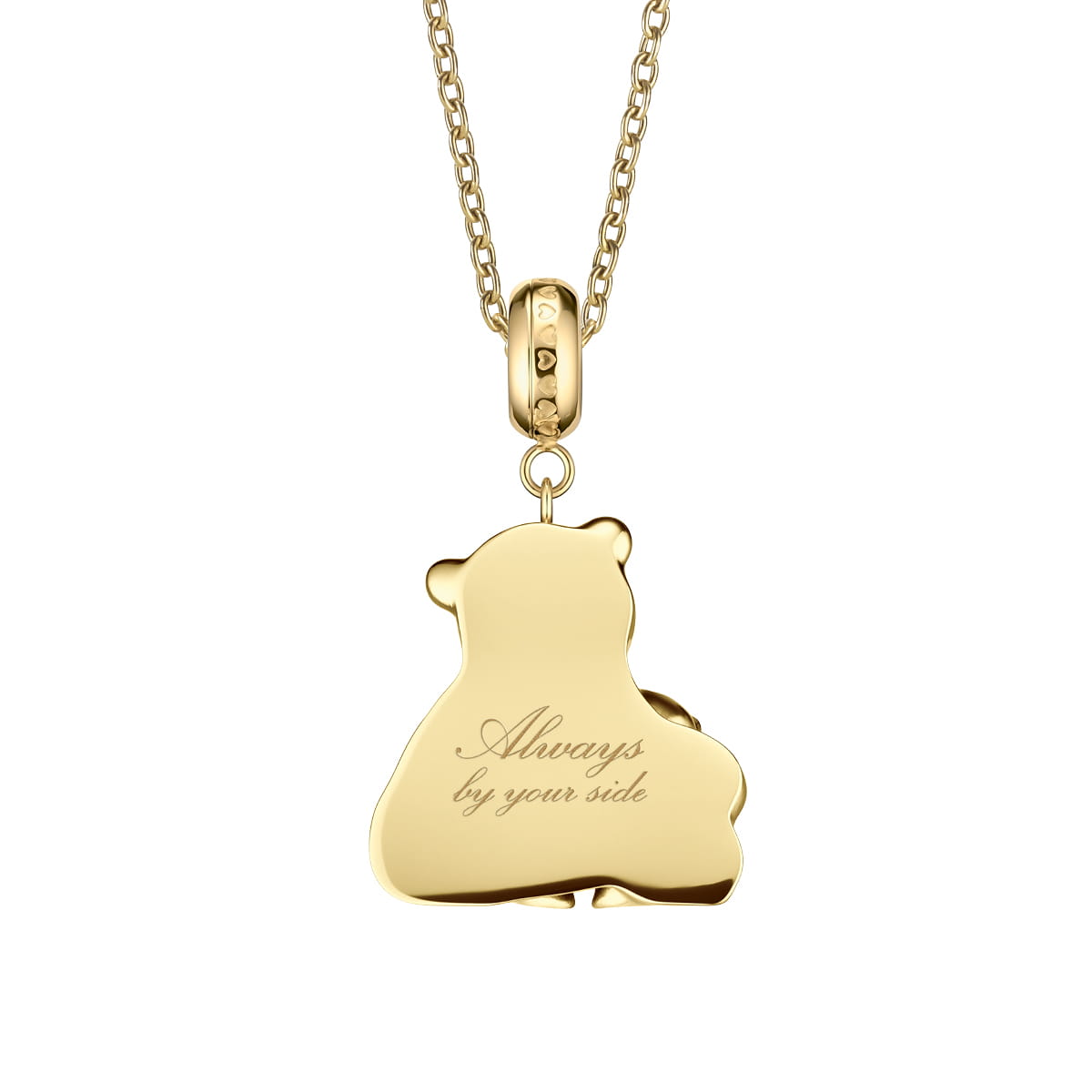 Die detailreich gestaltete Szene zeigt eine Eisbärenmutter, die ihr Junges schützend an sich hält. Die weich fließenden Formen und die glänzende, goldfarbene Oberfläche verleihen dem Design eine besondere Tiefe und Wärme. Funkelnde klare Zirkonia-Steine setzen leuchtende Akzente im Körper der beiden Bären und erinnern an das Glitzern von Sonnenlicht auf arktischem Eis. Die feinen dunklen Details in Augen und Nase bringen Ausdruck und Lebendigkeit in das Motiv. Die polierte Öse mit dezent eingravierten Herzmotiven fügt sich harmonisch in die Kette ein und unterstreicht die emotionale Botschaft des Schmuckstücks.