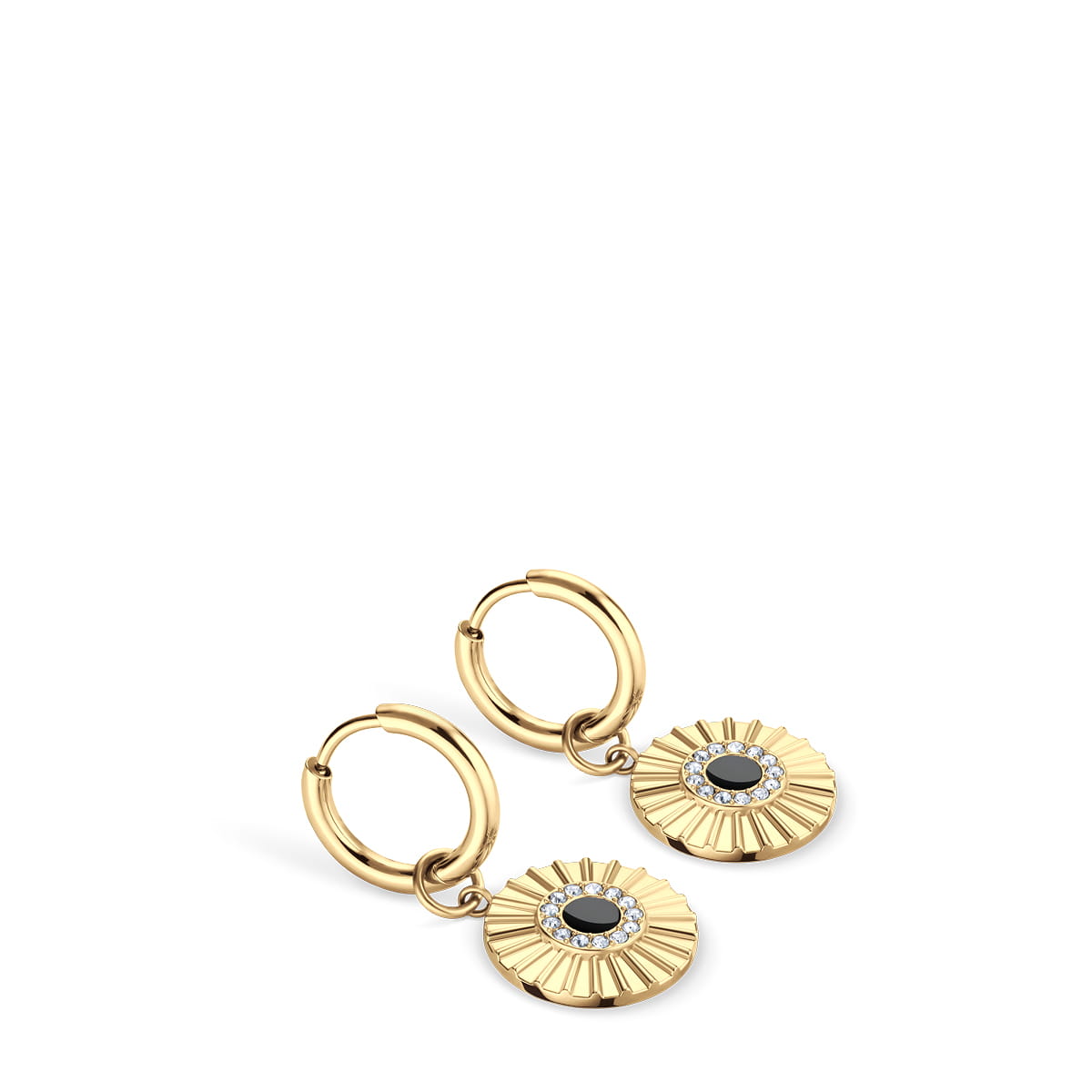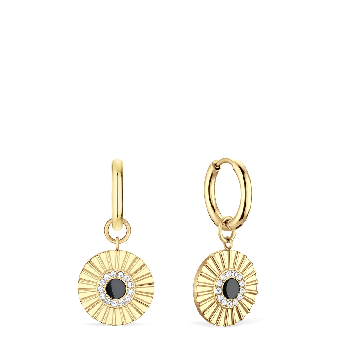 The 765-260-05 earrings combine bold elegance with timeless sophistication. Their circular sunburst design captures light beautifully, while the deep black stone at the centre, framed by sparkling crystals, adds a striking contrast that exudes confidence and mystery.
