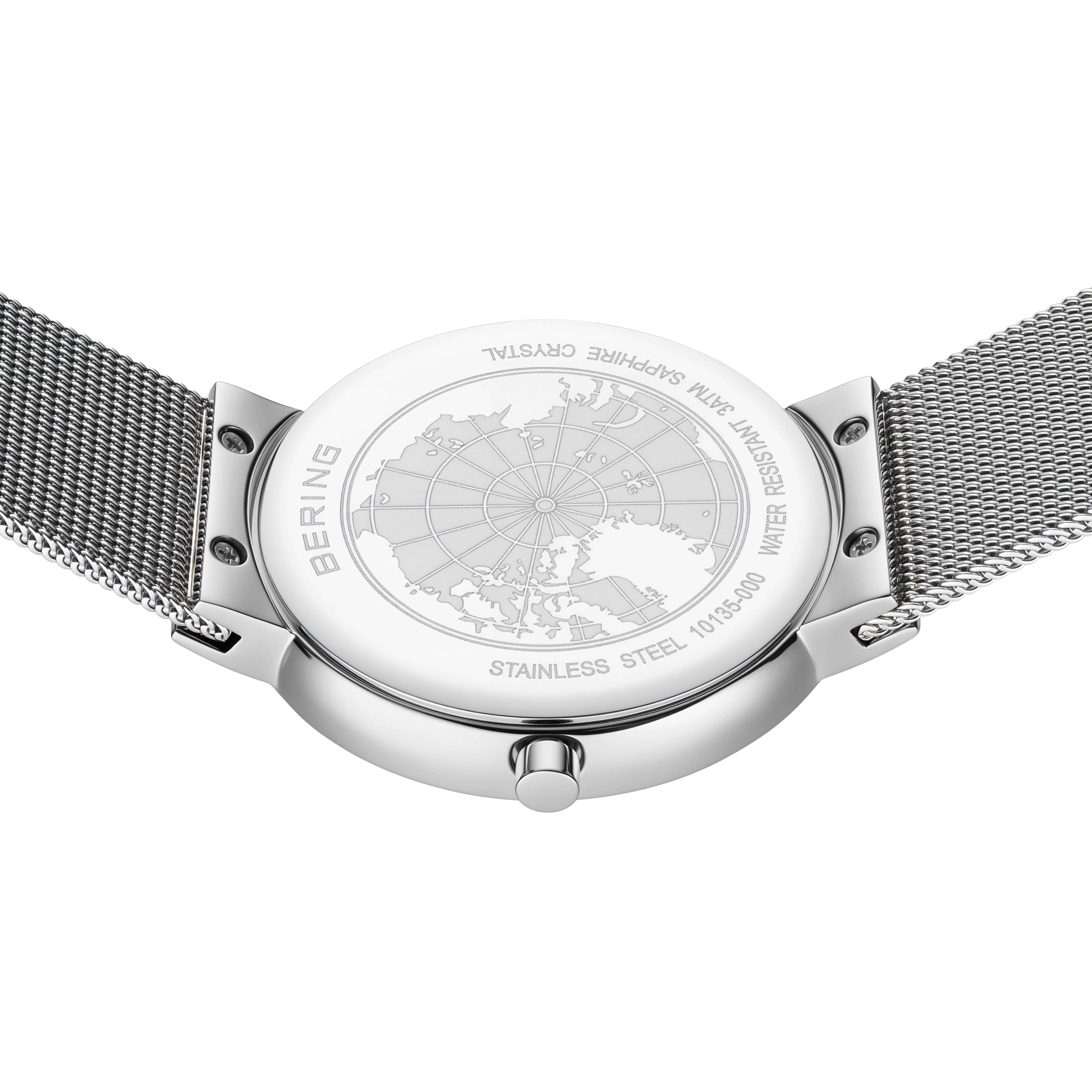 The BERING 10135-000 embodies the essence of Arctic beauty: minimalist, clear and timeless. Its softly brushed silver dial is adorned with four genuine diamonds – a subtle luxury that whispers rather than shouts. The ultra-slim stainless steel case merges seamlessly with the fine Milanese mesh bracelet, creating an elegant silhouette that gently wraps around your wrist.