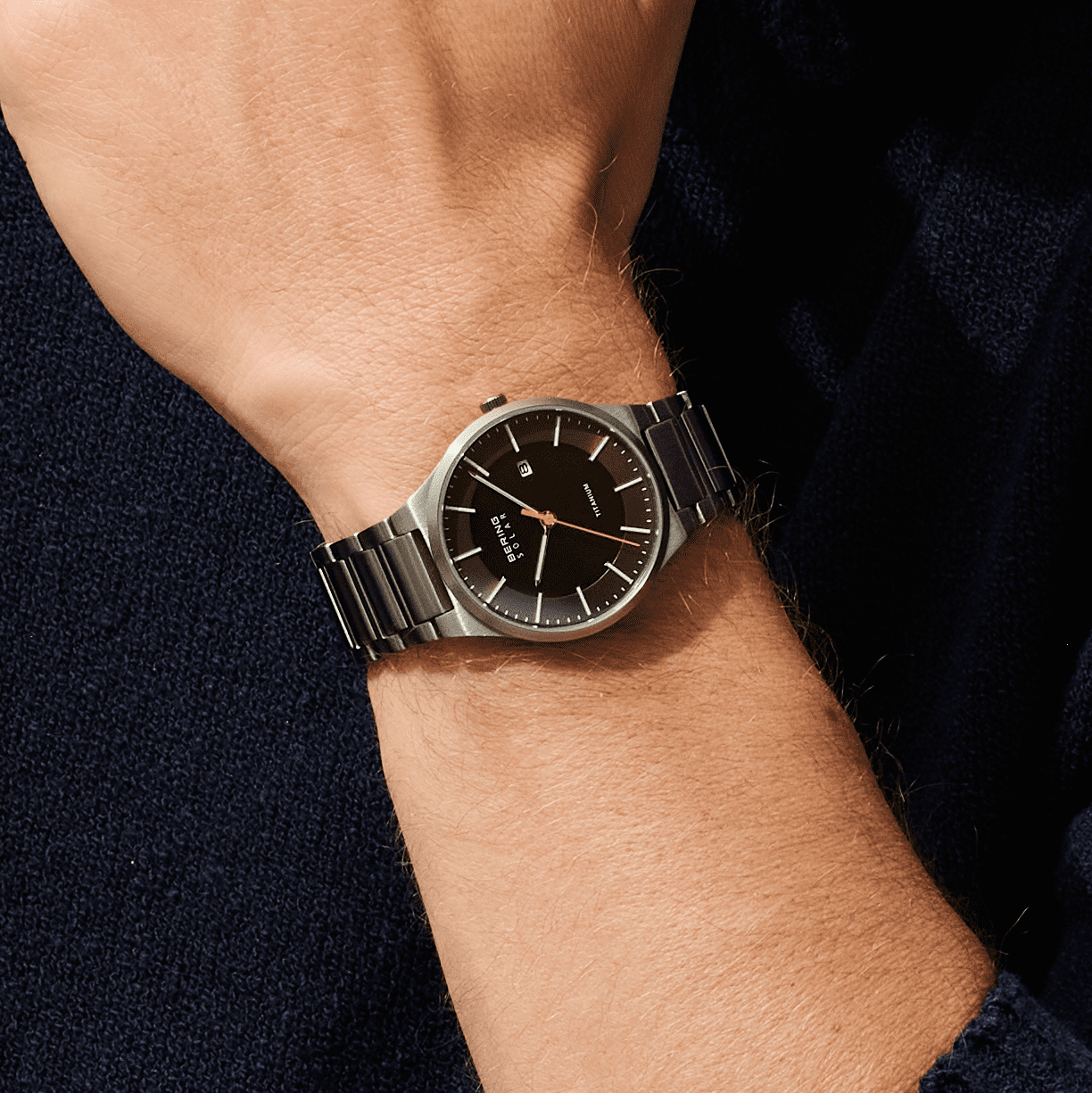 Ligero como el aire, fuerte como el Norte: este reloj para hombre de la colección BERING Solar combina un diseño minimalista con la resistencia del titanio. La caja y el brazalete de titanio en color plata, con acabado cepillado sedoso, destacan por su precisión técnica y líneas depuradas. El contraste entre la esfera gris de textura fina y los detalles en naranja brillante de las agujas aporta un toque sutilmente deportivo y dinámico.