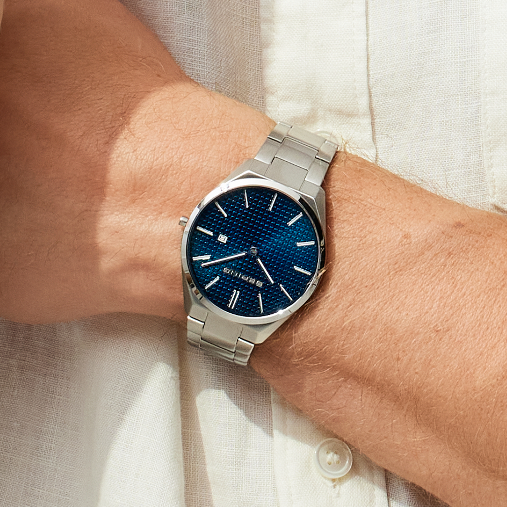 Este BERING Ultra Slim aporta estructura al minimalismo: con una esfera azul profunda y texturizada, transmite una elegancia técnica que combina claridad y carácter. La caja de acero inoxidable pulido y cepillado, de solo 6 mm de grosor, parece tallada en una sola pieza, reflejando la luz con precisión y sobriedad.