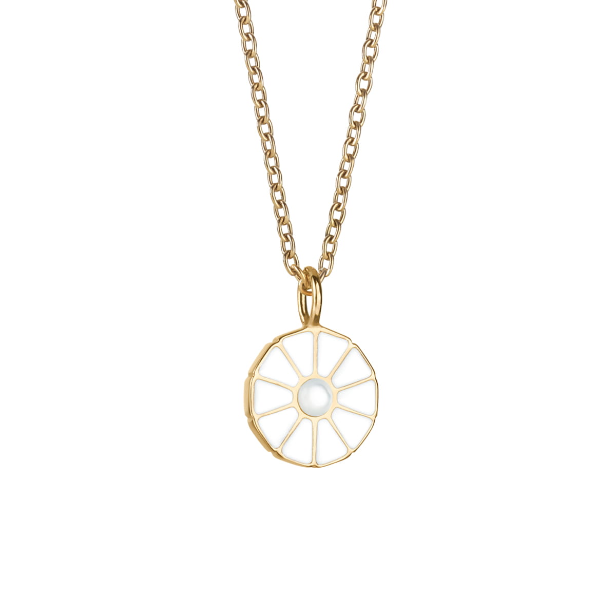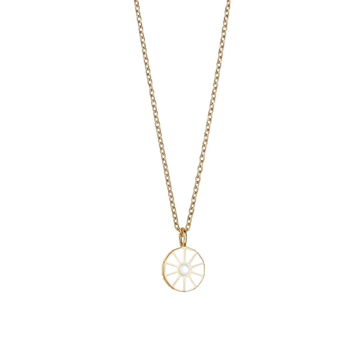 Crafted from gold-tone stainless steel, this necklace features a round pendant inspired by a sun wheel or compass rose – representing clarity, direction, and serenity. The fine, radiant spokes encircle a gleaming mother-of-pearl centre, adding an air of delicate sophistication and mindful meaning.