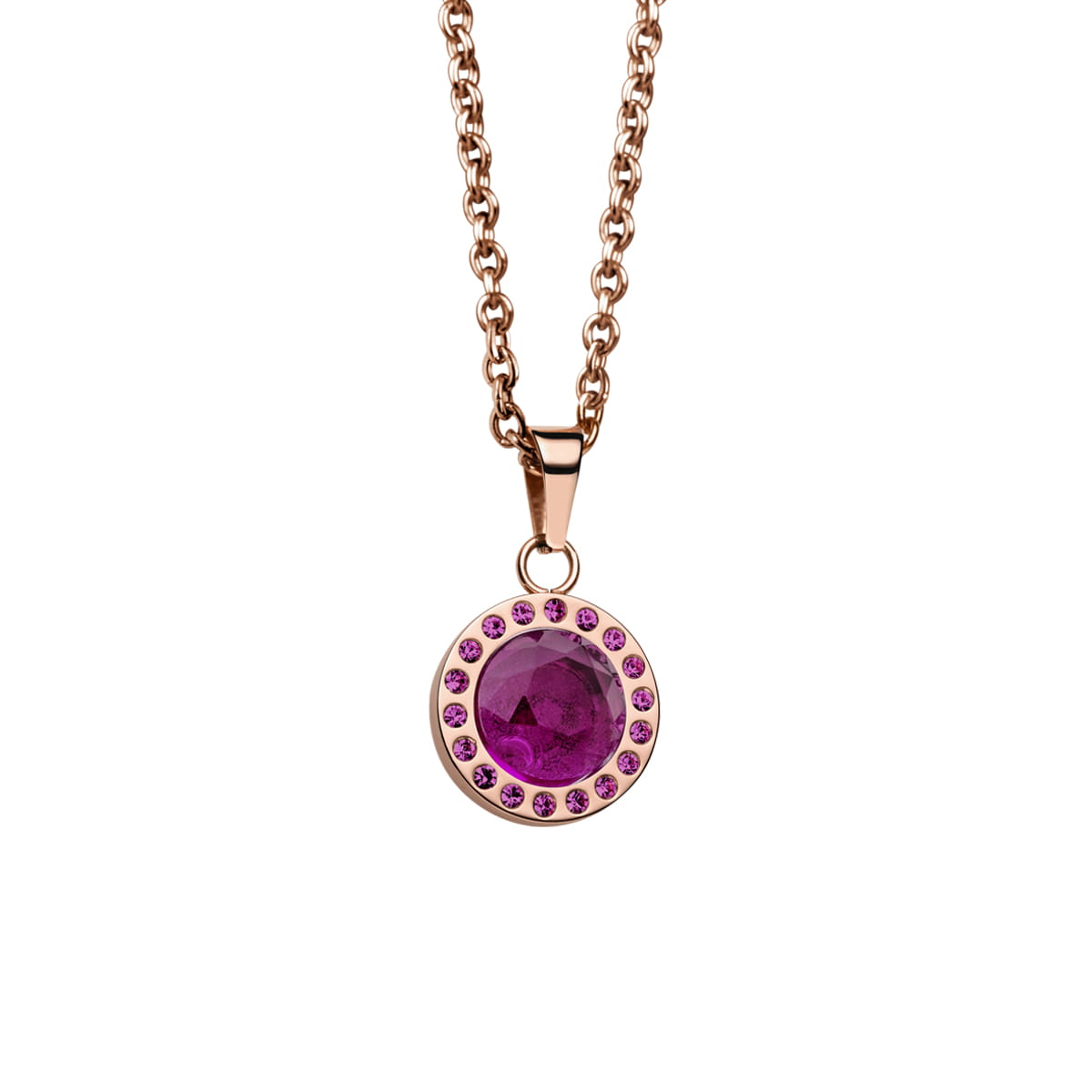 The pendant hangs from a delicate rose gold-tone stainless steel chain. The warmth of the finish amplifies the brilliance of the pink tones and adds a touch of modern charm.